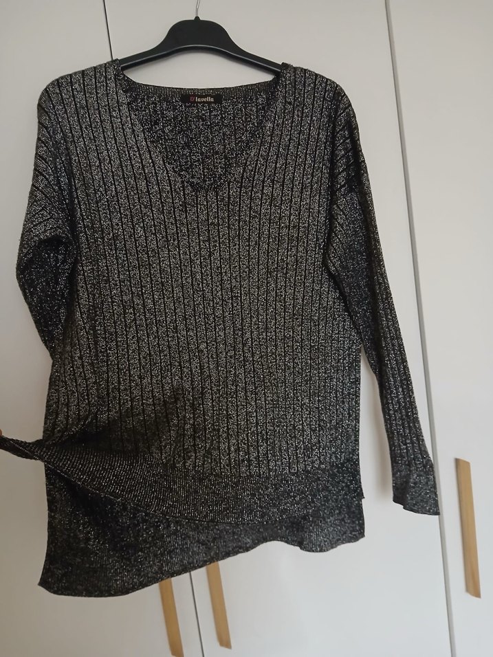 Gri renkte, V yakalı ve uzun kollu triko kadın kazak. Bol kesim ve normal midi boyda, günlük sokak stili için uygun.