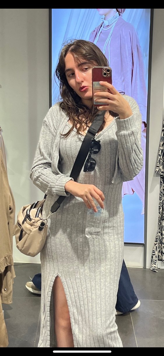 Gri renkli, V yakalı ve uzun kollu triko midi elbise, rahat sokak stili ve zahmetsiz şıklık sunar. Günlük kullanım için uygundur.