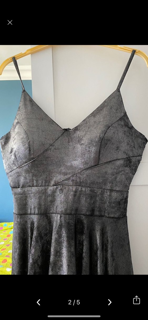 Gri renkte, V yakalı ve askılı, drapeli uzun ve dar kesim gotik abiye elbise. Parti için uygundur. 1 kez kullanıldı