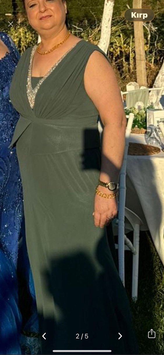 Gri renkte, V yakalı ve drapeli uzun abiye elbise. İnce askılı, fit kesim ve hafif yılan deseniyle klasik ve bohem tarzı bir araya getirir.