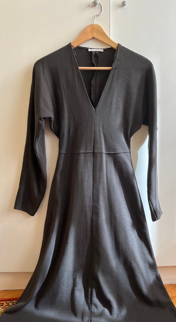Gri uzun elbise, V yakalı ve uzun kollu. drapeli kesimi günlük kullanım için uygundur. Minimalist ve çağdaş tarzda şık bir görünüme sahiptir. Elbise boy 126 cm bel 66