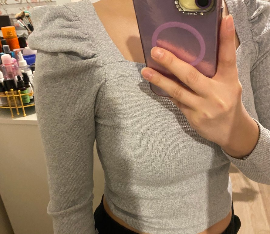 Gri renkli, V yakalı ve düğmeli detaylı uzun kollu, vücuda oturan crop top. Rahat sentetik kumaştan, günlük sokak stili için uygun.