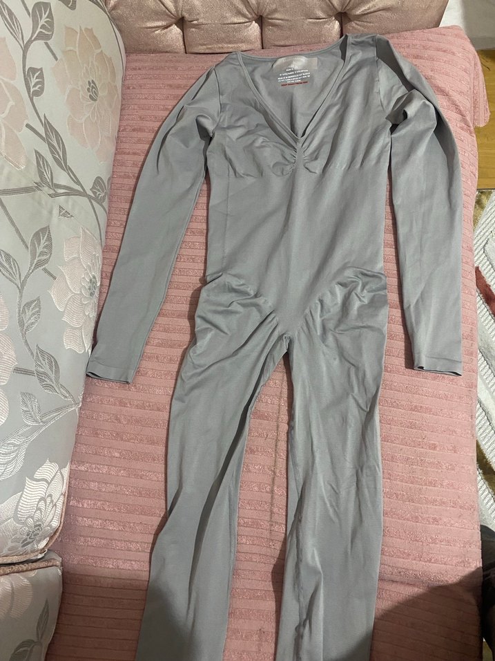 Kadınlar için uzun kollu, v yakalı ve fitted kesim gri tulum. Düz ve sade tasarımıyla günlük kullanıma uygundur, sentetik kumaştan üretilmiştir.