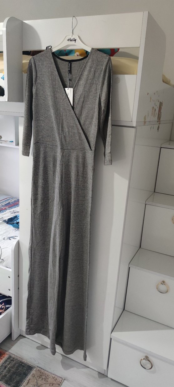 Gri renkte, V yakalı ve uzun kollu, drapeli tasarıma sahip, yumuşak sentetik kumaştan yapılmış, minimalist ve çağdaş görünümlü, vücuda oturan uzun tulum.