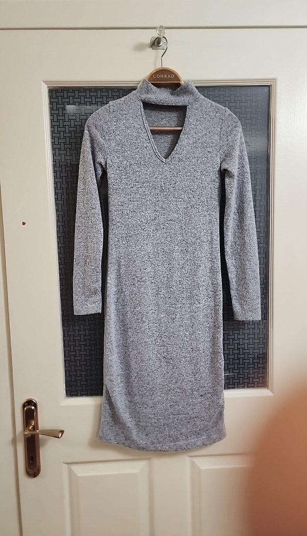Gri renkte, V yakalı ve uzun kollu, vücuda oturan triko elbise. Yumuşak sentetik kumaştan, uzun boy ve sade tasarım günlük kullanım için uygun. boy105 cm iki kol arasi 39 cm