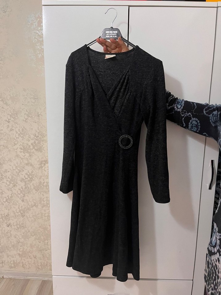 V yakalı, uzun kollu ve kemerli bel detayı olan gri triko elbise. Bağlama deseniyle rahat ve şık bir görünüm sunar.
