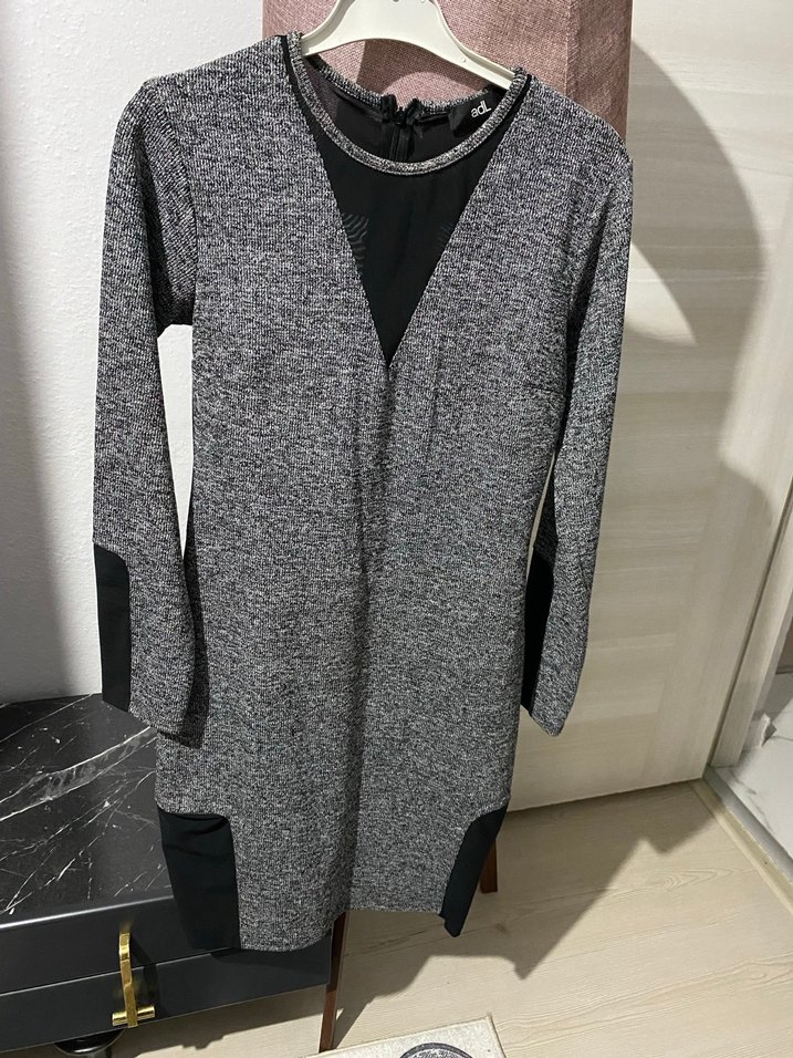Gri renkli, V yakalı ve uzun kollu triko elbise Siyah kumaş detaylarıyla örgü dokusuna sahip, günlük rahat kullanım için uygundur.
