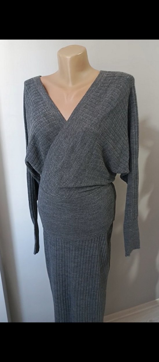 S-M uyumludur. Gri renkte, V yakalı ve uzun kollu, yumuşak triko kumaştan yapılmış, vücuda oturan kadın etek takım. Günlük kullanım için rahat ve modern bir stil sunar.
