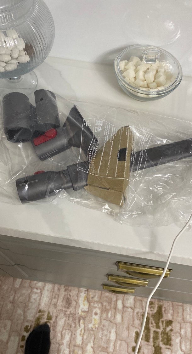 Çeşitli temizlik ihtiyaçları için uygun, koyu gri renkte vakum temizleyici aksesuarları plastik ambalajda paketlenmiştir.