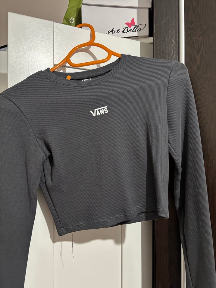 Uzun kollu, bol kesim gri Vans crop top, baskılı logo ve yumuşak, sıcak kumaşla rahat dış mekan kullanımı için uygundur.
