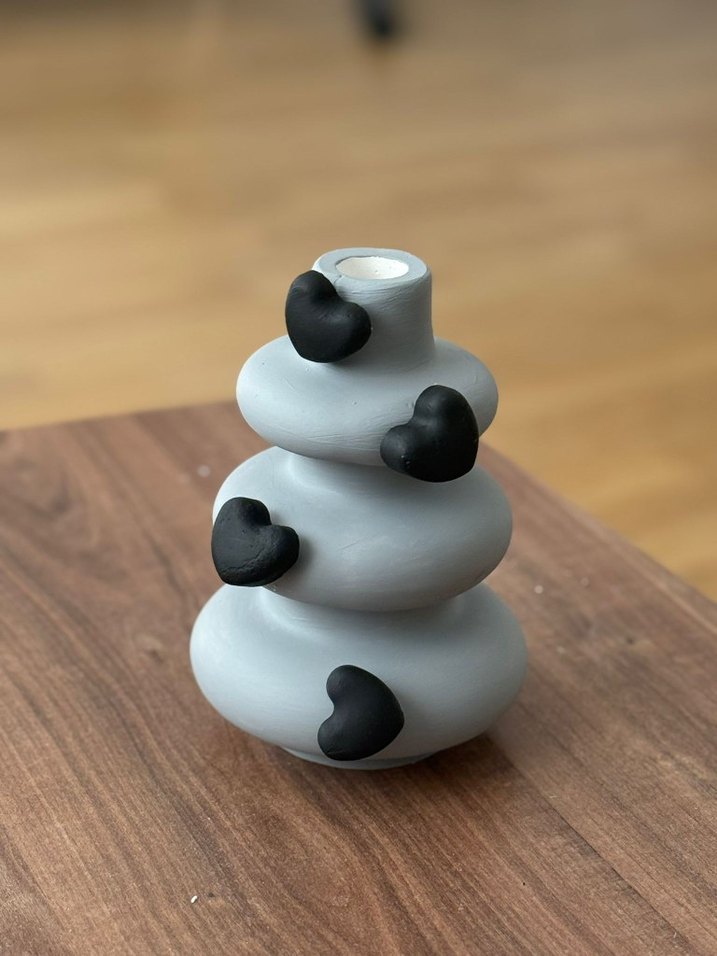 Katmanlı tasarıma sahip gri vazo, siyah kalp detaylarıyla süslenmiştir.