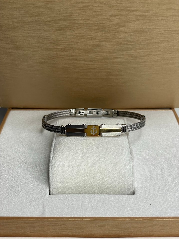 Gümüş renk ve altın detaylara sahip, çapa motifi bulunan minimalist erkek bileklik. Klasik zarafeti modern bir tasarımla sunar. ⚓ Orta kısmında gold renkli artı şeklinde parça mevcut,bu parçanın orta kısmında çapa deseni var,her iki yanında gümüş dikdörtgen parçalar olan,üçlü burgu detaylı kordona sahip olan,altta çiftli açılıp kapanabilen gümüş renk çıkarılıp takılabilen çelik klipsli aparat olan şık erkek bileklik. Genişlik:21,5 CM Eni:0,5 MM