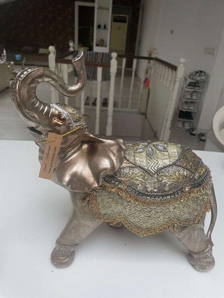 Gri fil biblosu, altın renkli ayrıntılar ve karmaşık desenlerle süslenmiş, yükseltilmiş hortumlu bir figürdür. Yeni etiketli hediye geldi yükseklik 33 santim eni 27 santimdir