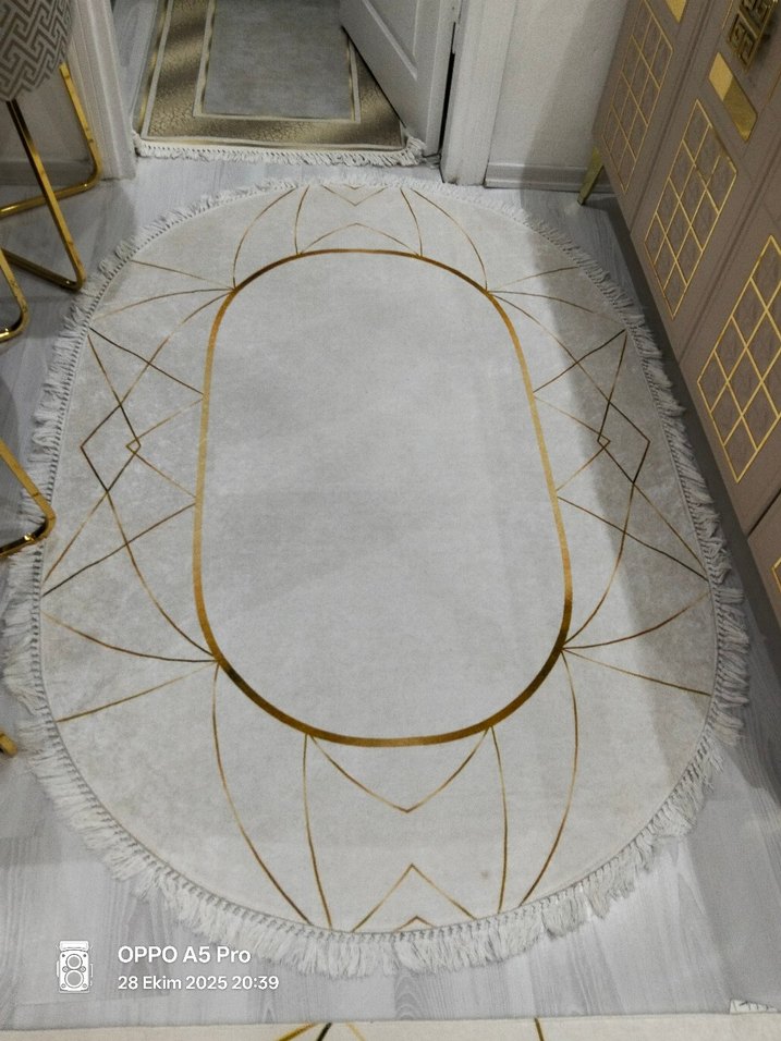 Gri zemin üzerine altın renkli çerçeve deseni ve püsküllü kenarlarıyla şık bir oval halı.2 adet var biri 4 m2