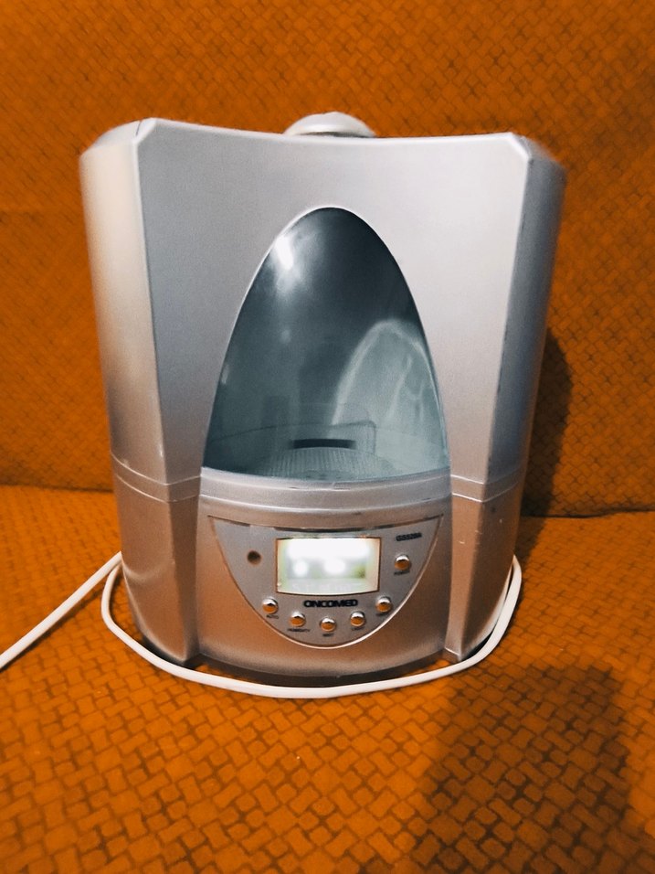 Dijital ekran ve kontrol düğmelerine sahip gri ve bej renklerde hava temizleyici ve nemlendirici. Hava kalitesini ve nem seviyesini artırır. ️