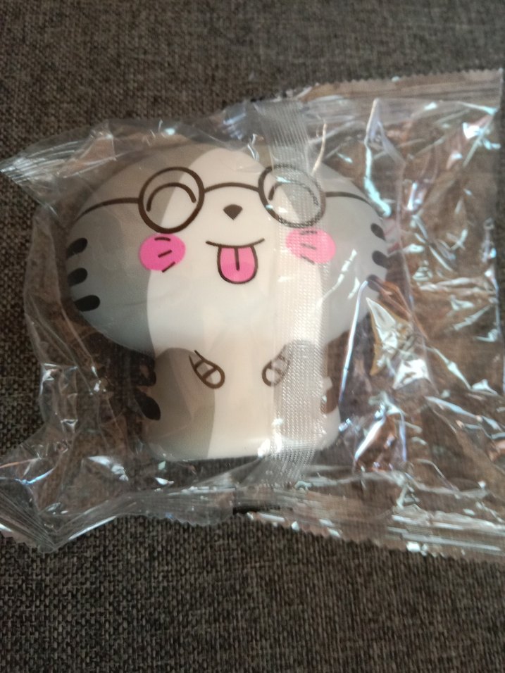 Gözlüklü ve pembe yanaklı sevimli karakter şeklinde, makyaj uygulaması için gri ve bej renklerde sünger.