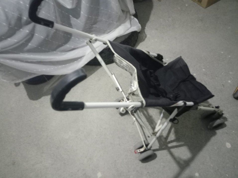 Beyaz hafif iskelet, gri kumaş oturma alanı ve siyah tutma kollarıyla kolay kullanımlı bebek arabası. temiz hiç bir sıkıntısı yok
