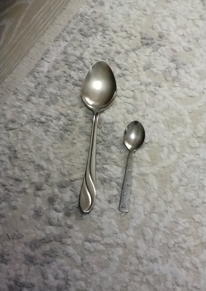 Gri ve beyaz tonlarda, sağlam çelikten yapılmış, farklı sap tasarımlarına sahip iki kaşıktan oluşan set.