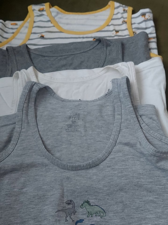 Gri ve beyaz tonlarında, düz ve çizgili desenli 4 adet çocuk atlet seti. Birinde küçük dinozor baskıları bulunur, yumuşak ve rahat kumaş.Kullanılmış üründür.Fiyata yansıtılmıştır.3 ü mother çare ürünüdür.2 sinin etiketi kesilmiş.Yırtık sökük yoktur.