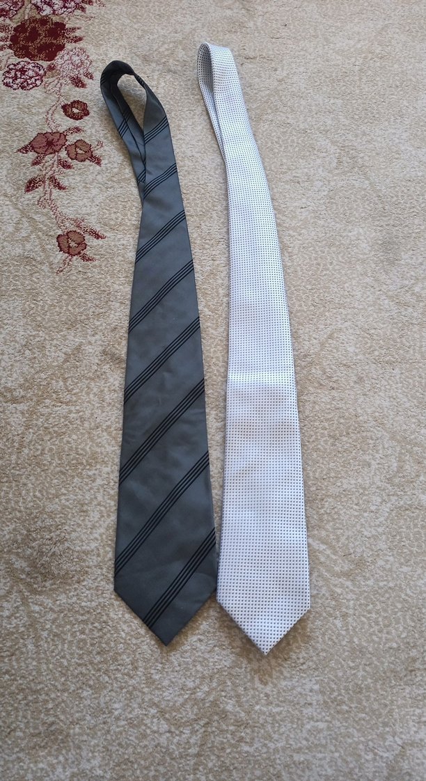 Gri ve beyaz renklerde, sade ve iş ortamına uygun desenlere sahip iki erkek kravatı. Biri çapraz çizgili, diğeri hafif noktalı desende.