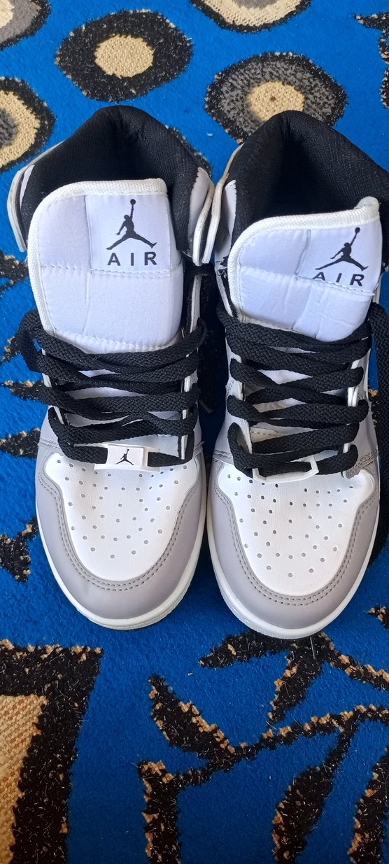 Siyah bağcıklarla beyaz ve gri Air Jordan logolu spor ayakkabılar. Athleisure ve sokak stili için uygun. 37 numara