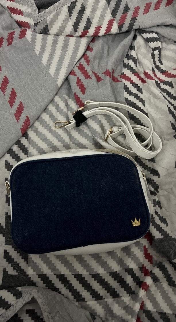 Yumuşak kumaşlı, fermuarlı kadın omuz çantası. Gri ön yüz ve beyaz yanlarla küçük taç detayı bulunur. Trendy günlük sokak stili için uygundur.