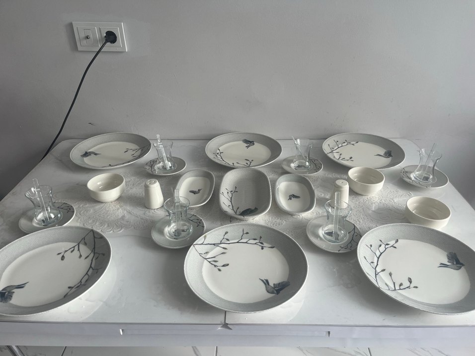 Gri ve Beyaz Kuş Desenli 6 kişilik kahvaltı Takımı