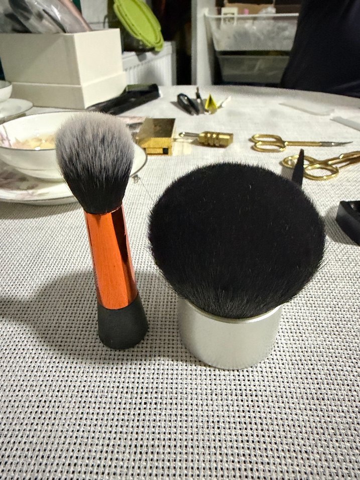 Turuncu saplı gri uçlu ve beyaz saplı siyah kıllı iki makyaj fırçası seti. ️
