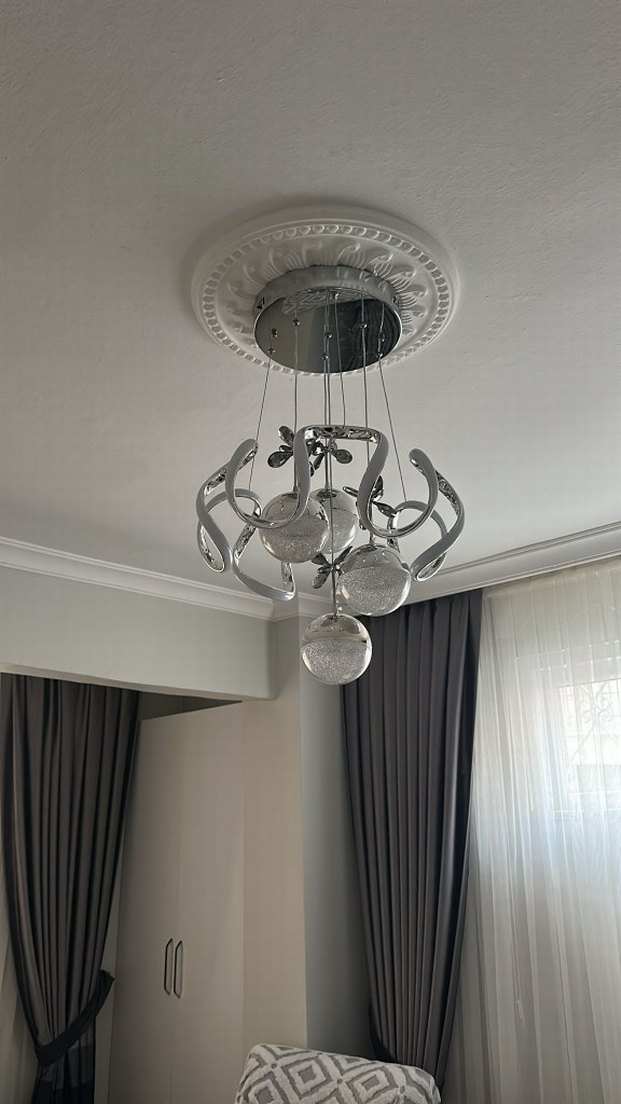 Gri ve beyaz renklerde, kıvrımlı metal kollar üzerinde üç cam küre bulunan modern sarkıt avize.