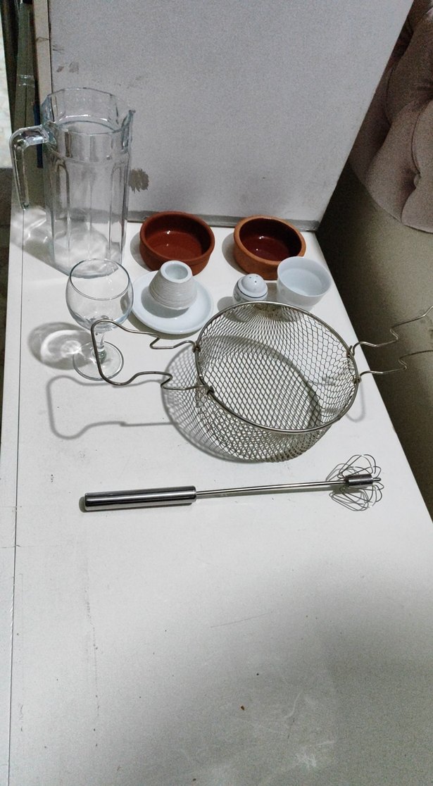 Set, şeffaf sürahi, bardak, iki kahverengi kase, beyaz porselen nutvsk aksesuar ve saplı metal fritöz süzgeç ve paslanmaz çelik çırpıcı içerir. ️hepsinin toplam fiyatıdır