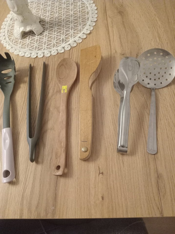 Gri ve beyaz renklerde, çeşitli pişirme işleri için uygun maşa, ahşap kaşıklar ve metal süzgeçlerden oluşan mutfak gereçleri seti. bastakiler hiç kullanilmadi sadece metal olan suzgecle masa kullanilmis diğerleri yeni