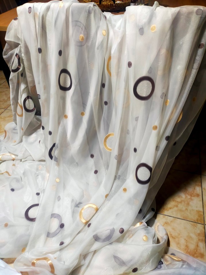 Gri nakışlı yuvarlak desenlere sahip beyaz tül perde, modern tarzda. Hafif ve ferah kumaş, mekana şıklık katıyor. salon tul 2=parçası 3x245 diger parçası ölçüp yazacam