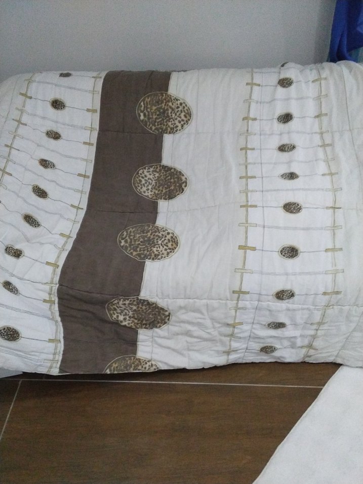 Gri ve beyaz renklerde nakışlı, oval leopar desenli detaylara sahip yatak örtüsü. ️yorgan, çift kişilik, hafiftir, 160 cm e 200 cm ölçülerinde, kullanılmış, sorunsuzdur