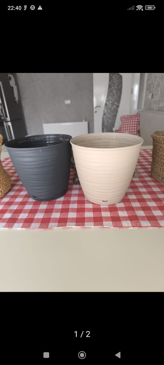 Gri ve beyaz renklerde, kabartmalı dokulu iki saksı seti. Dekoratif amaçlı kullanılabilir.