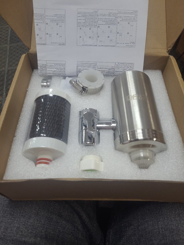 Gri karbon filtre, paslanmaz çelik gövde ve montaj aksesuarları içeren su arıtma filtresi seti. iki kartuşlu ve sıfır ürün