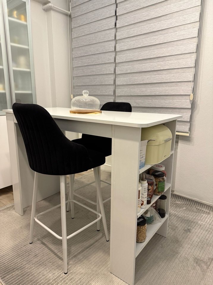 Gri oturak ve beyaz ayaklara sahip, yüksek oturma için tasarlanmış bir yüksek sandalye. Rahat sırt dayanağı ve sağlam yapıya sahiptir.