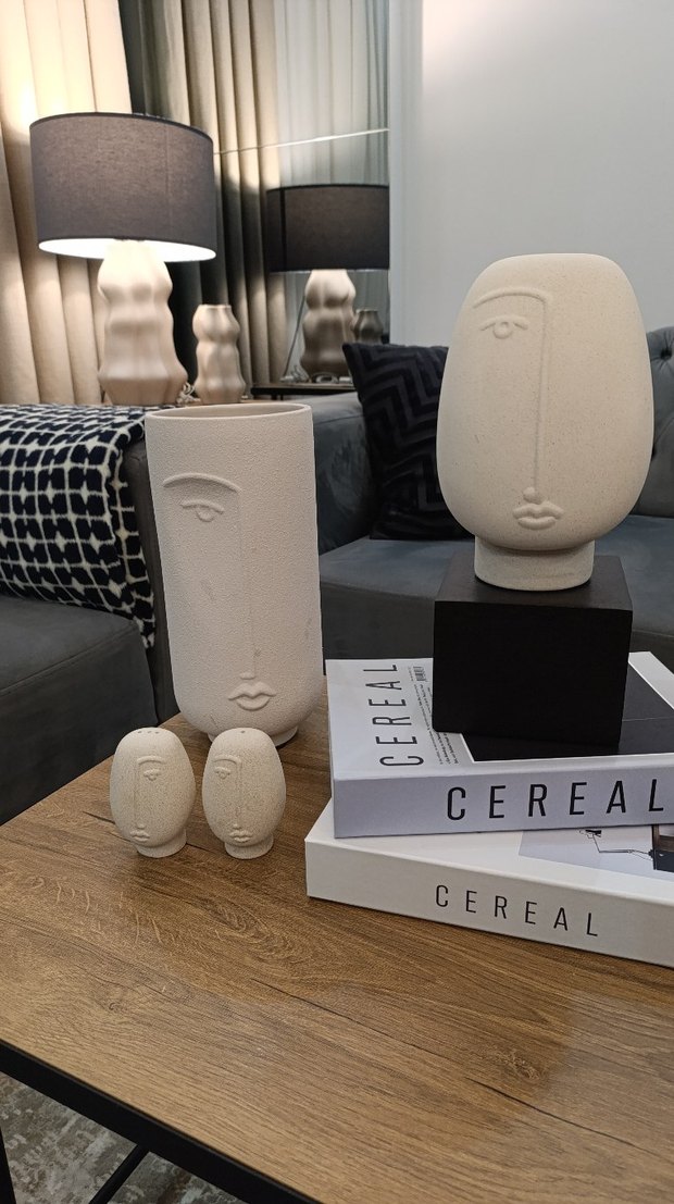 4 parça Gri ve beyaz renklerde h&m marka vazo tuzluk takımı biraz leke mevcuttur ama temizlenebilir.