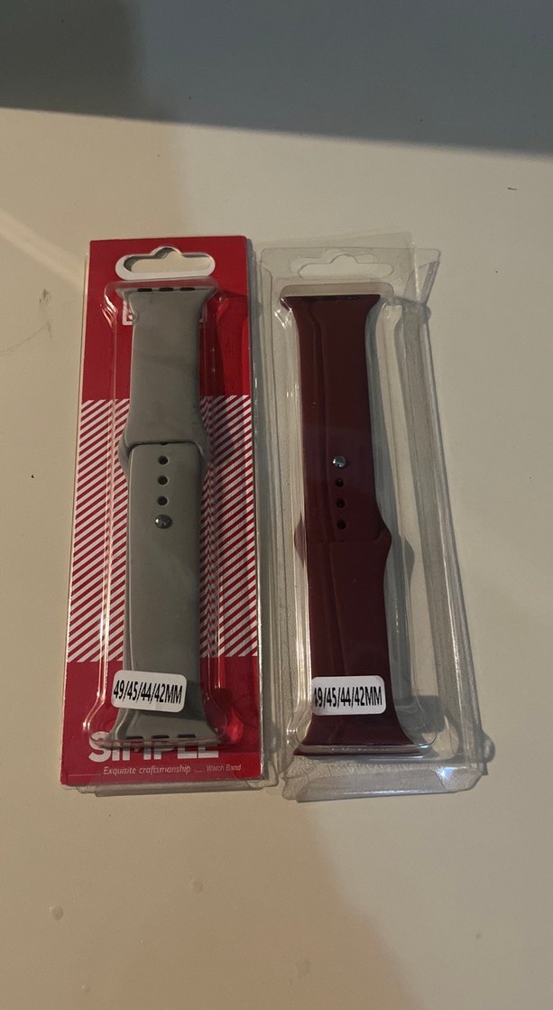Gri ve bordo renklerde, 42mm ölçüsünde minimalist saat kordonları. ⌚buyuk geldigi icin bilegime satiyorum