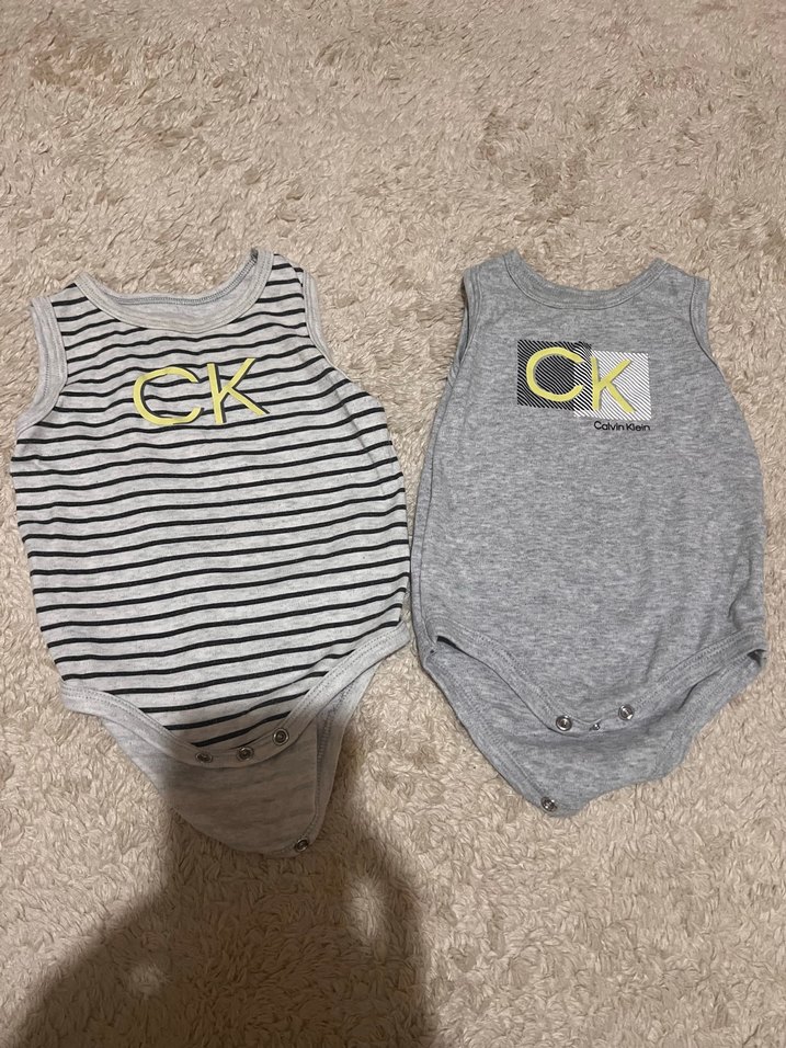 Gri tonlarda, yumuşak pamuklu örgü kumaştan, CK logosu bulunan iki adet kolsuz bebek body. Biri düz gri, diğeri çizgili desenlidir.