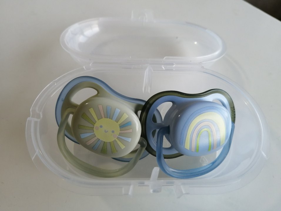 Gri ve çok renkli, güneş ve gökkuşağı desenli iki bebek emziği seti. Şeffaf plastik kutu ile birlikte gelir. Sadece denendi. Ama bebeğim tutmadı. Görüldüğü gibi sıfır gibi. Herhangi bir sararma mevcut değil.