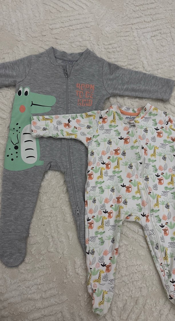 Yumuşak ve sıcak kumaştan, biri gri timsah baskılı, diğeri renkli hayvan desenli iki bebek tulumu. Mine center marka. Çok az kullanıldı.