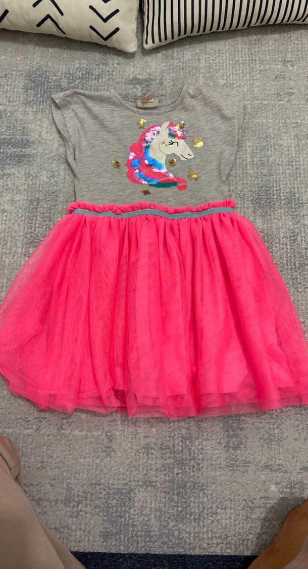 Kolsuz, fitted gri üst kısmı renkli unicorn nakışıyla süslenmiş, fuşya fırfırlı etek detaylı kız çocuk elbisesi.
