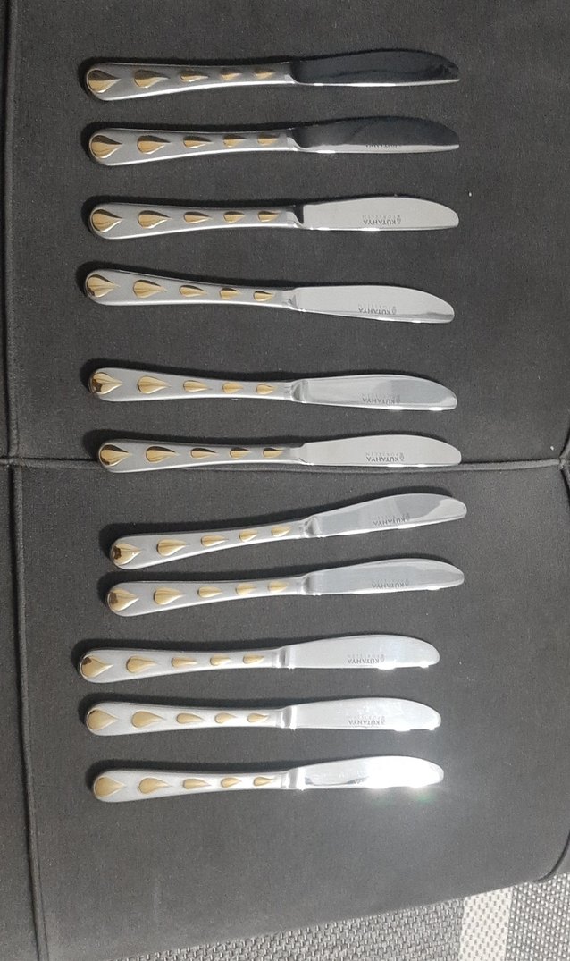 Gri ve gold damla desenli saplara sahip 12 bıçak içeren set. Bıçaklar yemek bicagıdır için uygundur. sıfır ayarındadır yeni dir