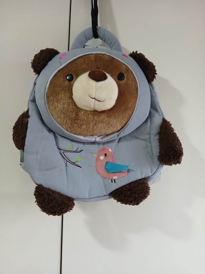 Dükkanımızı kapattık kalan ürünleri satıyoruz. ÜRÜN YENİDİR. Yumuşak peluş ayıcık tasarımlı, gri ve kahverengi renklerde çocuk okul çantası. Önünde kuş nakışı bulunur, taşıma sapı ve askıları vardır. 25x25 cm