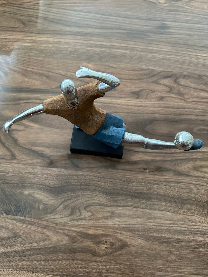 Gri tonlarda futbol topu ile poz veren, kahverengi üst ve mavi şortlu futbolcu figürü, siyah kaide üzerinde yer alıyor. ⚽