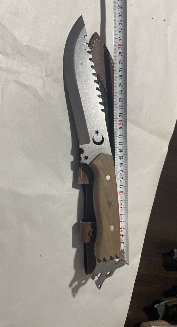 Gri testere dişli bıçağa ve kahverengi ahşap saplıdır. Deri kılıfı ile birlikte yaklaşık 30 cm uzunluğundadır.