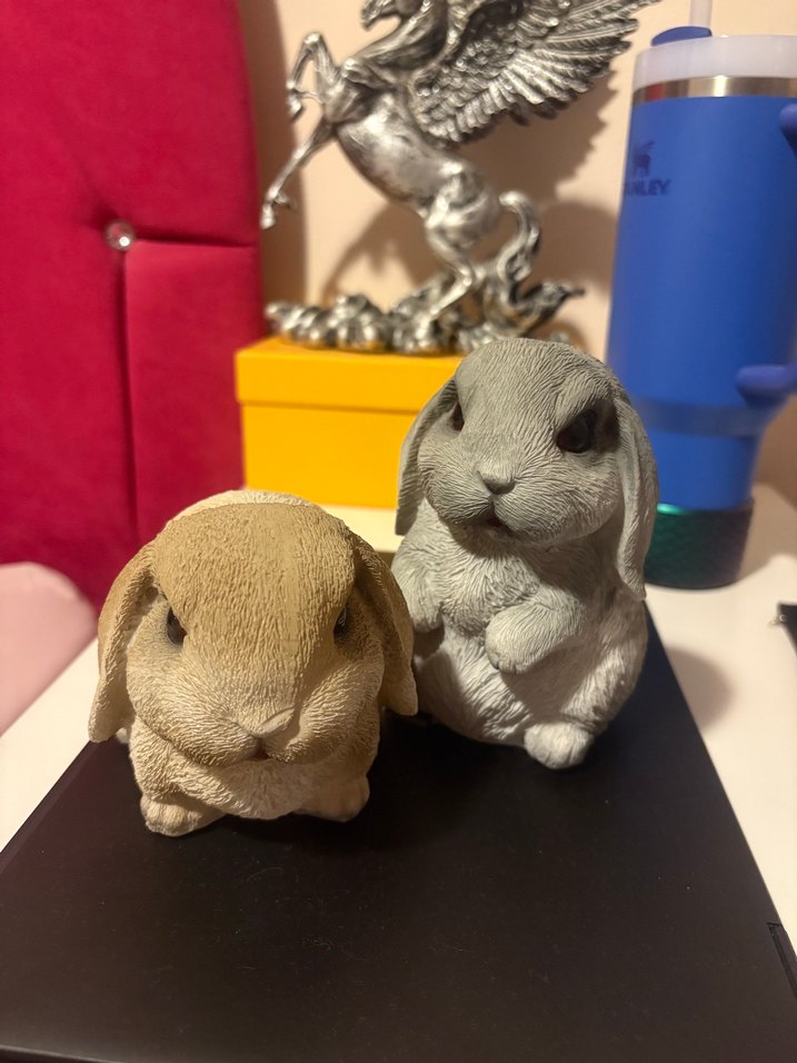 Gri ve açık kahverengi renklerde, gerçekçi dokulara sahip iki küçük tavşan figürü. Çok iyi durumdalar ve sorunsuzlar. İkili fiyattır istem durumunda tekli alım da yapılabilir