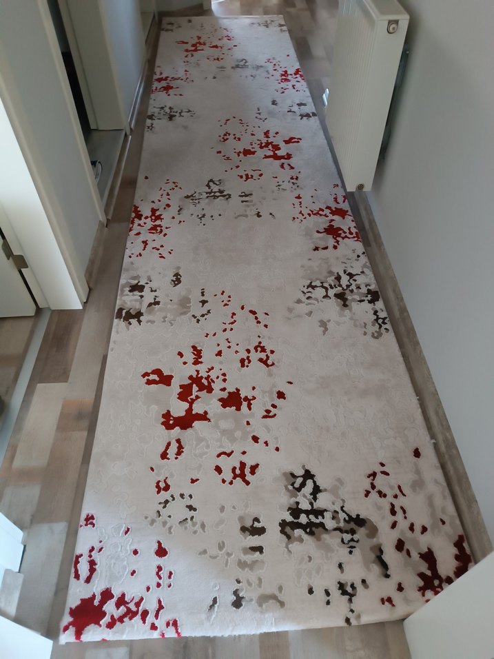Gri ve kırmızı tonlarda baskılı desenli çağdaş halı, modern bir dokunuş sağlar. Şık ve canlı renkler mekana hareket katar. 100/430 100/370 2 adet bulunuyor tek adet fiyatıdır