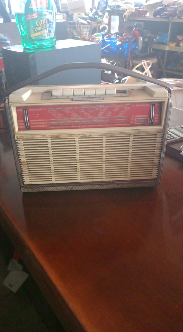 Üstte kontrol düğmeleri ve tutacaklı gri-kırmızı taşınabilir müzik sistemi. Ön tarafta hoparlör ızgarası ve klasik tasarım bulunur.