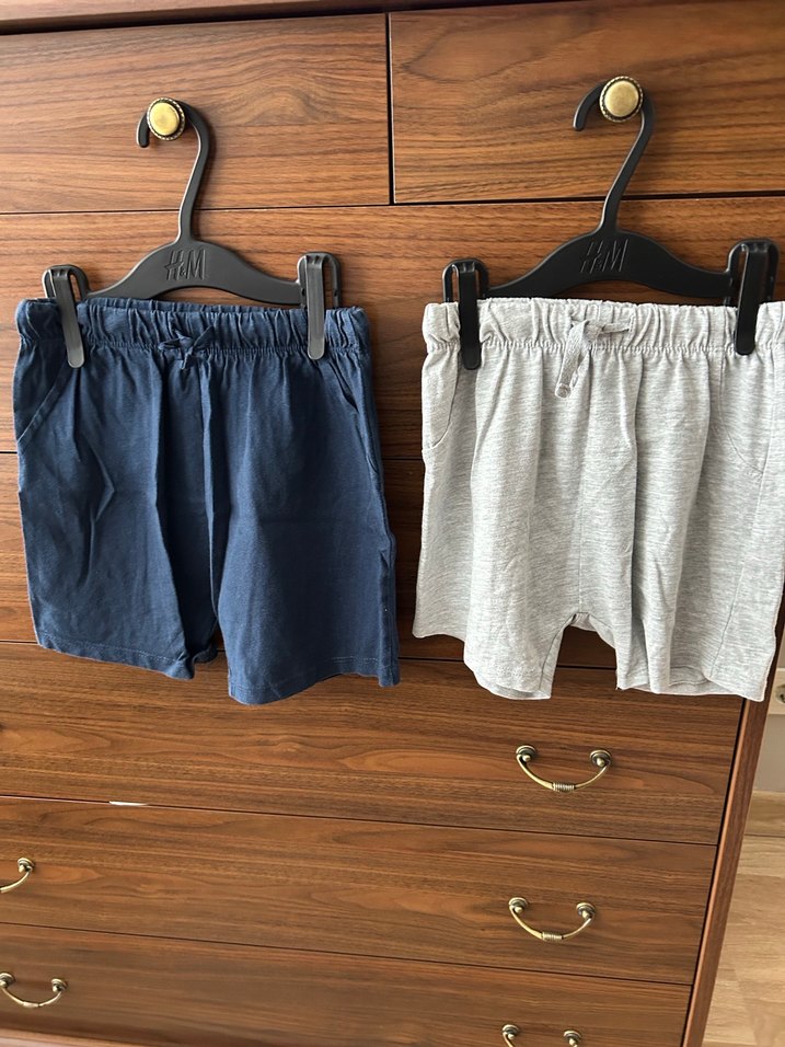 Pamuklu kumaştan yapılmış, gri ve lacivert renklerde, rahat kesimli erkek çocuk şortları.